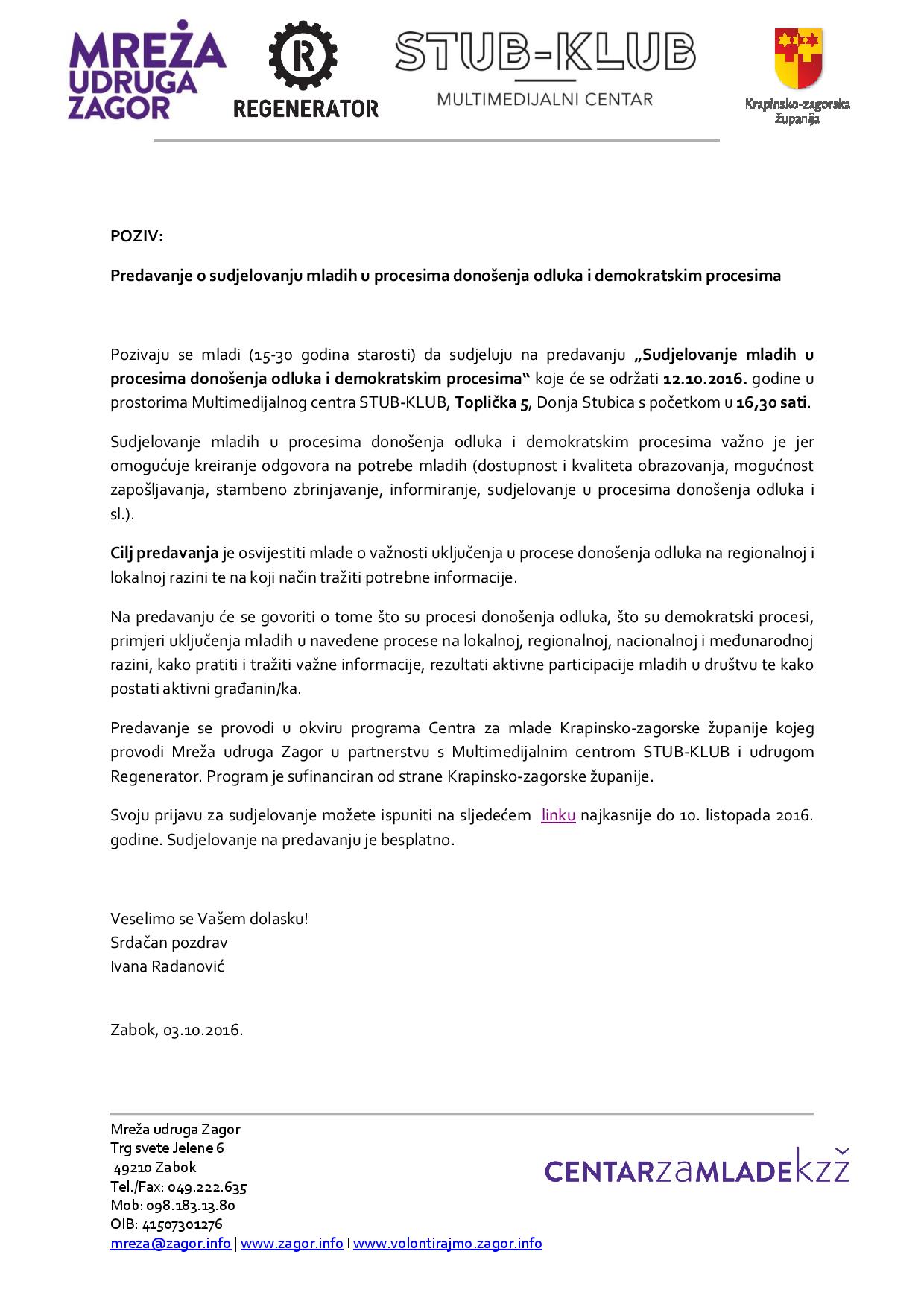 Novosti 12.10.2016 POZIV - Predavanje: Sudjelovanje mladih u procesima donošenja odluka i demokratskim procesima Link za prijavu: https://docs.google.com/forms/d/1oU7YpRtErJIdUPah-Yz7rY5vRRedu8twJOl5-F0sLQk/viewform?edit_requested=true